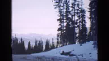 Shot on 8mm film in 1939, this vintage home movie captures a snowy mountain road winding through a dense evergreen forest in Utah. The view, framed by dark window edges, shows a winding dirt path flanked by snow-covered slopes and tall pine trees under a pale sky. Distant snow-capped peaks rise in the background, creating a serene winter landscape. The footage exhibits classic Super 8 film grain, slight color fading, and natural camera movement, evoking a nostalgic sense of mid-century travel and nature exploration.