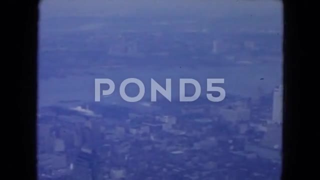 1954: A vintage 8mm home movie captures an aerial view above Manhattan, showcasing New York City's iconic skyline. The Empire State Building and other high-rise skyscrapers dominate the urban landscape, with the Hudson River and surrounding bridges visible below. This nostalgic footage offers a classic glimpse of mid-century Manhattan, highlighting its bustling business district and architectural grandeur. The grainy, warm tones of the 8mm film enhance the retro charm, making it ideal for documentaries, editorial content, or nostalgic storytelling about 1950s America.