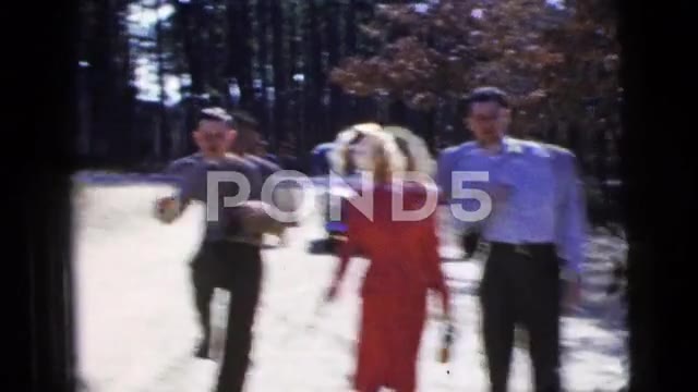 1956: Young men in dressy suits and ties gather in a cozy New York City living room, smoking cigarettes and drinking from bottles while sitting on a couch. They laugh, sing, and share a lively, expressive moment in this vintage 8mm home movie. The scene captures a nostalgic slice of mid-century American social life, with a bookcase and patterned wallpaper adding to the period atmosphere. This authentic 1950s home movie footage offers rich retro charm and emotional authenticity, ideal for documentaries, editorial content, or nostalgic storytelling.