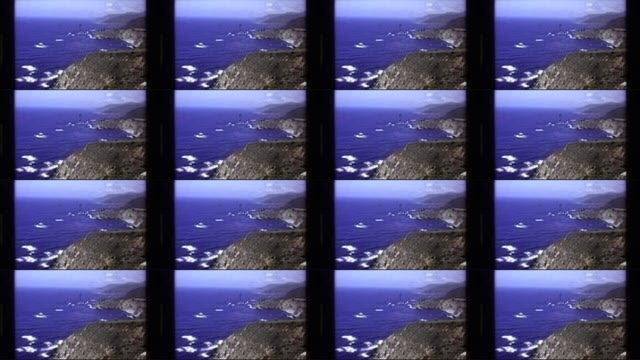 1980: Cars drive across a tall bridge beside the ocean in Big Sur, California, captured on vintage 8mm film. The scenic coastal highway winds along the rugged coastline with crashing waves below and green mountains rising in the background. This authentic home movie footage showcases classic American road trip nostalgia, with natural light and film grain enhancing the retro aesthetic. Ideal for documentaries, editorial content, or vintage-themed projects exploring 1980s Americana and coastal travel.
