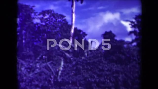 Vintage 1944 8mm home movie footage captures a serene tropical lagoon surrounded by lush green hills and dense palm trees. The natural beauty of the shoreline, with calm waters and abundant foliage, evokes a sense of peaceful isolation and timeless escape. This rare archival clip, shot on classic 8mm film, offers a nostalgic glimpse into a tropical paradise, likely in Papua New Guinea. The soft, grainy texture and natural lighting enhance the authentic, documentary feel of this historic footage. Ideal for historical documentaries, editorial content, or nostalgic storytelling about mid-20th century travel and nature.