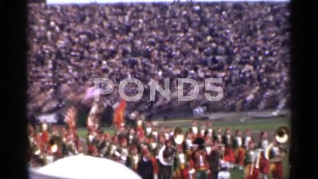 1944: Military members march in formation through San Francisco, California, carrying American flags during a patriotic parade. The vintage 8mm footage captures soldiers in uniform saluting and processing past a stadium, showcasing red, white, and blue bunting and a strong sense of national pride. This historic home movie offers a rare glimpse into wartime civic life, with clear visuals of the Stars and Stripes and ceremonial military presence. The grainy, authentic quality of the 8mm film enhances its nostalgic and archival value, making it ideal for documentaries, historical content, and editorial projects focused on American patriotism during World War II.