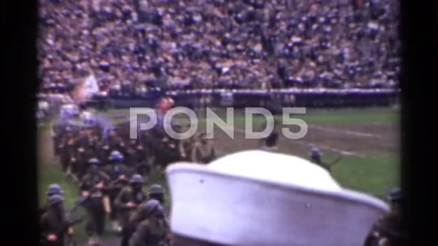 1944: A vibrant vintage 8mm home movie clip capturing a patriotic parade in San Francisco, California. Crowds gather in a packed stadium, waving American flags and celebrating with enthusiasm. Men, women, and children participate in the festive procession, creating a lively and nostalgic scene of wartime unity and community spirit. The grainy, authentic film quality enhances the historical charm, offering a rare glimpse into mid-20th century American civic life and public celebration during World War II.