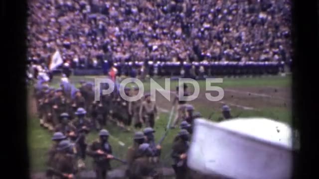 1944: A large group of U.S. Army soldiers carry the American flag during a patriotic parade in San Francisco, California. The crowd watches intently as the flag is marched through the streets, symbolizing national unity and wartime sacrifice. This vintage 8mm home movie footage captures the disciplined procession and public pride of the era, offering authentic archival material for historical documentaries, editorial content, and nostalgic storytelling.